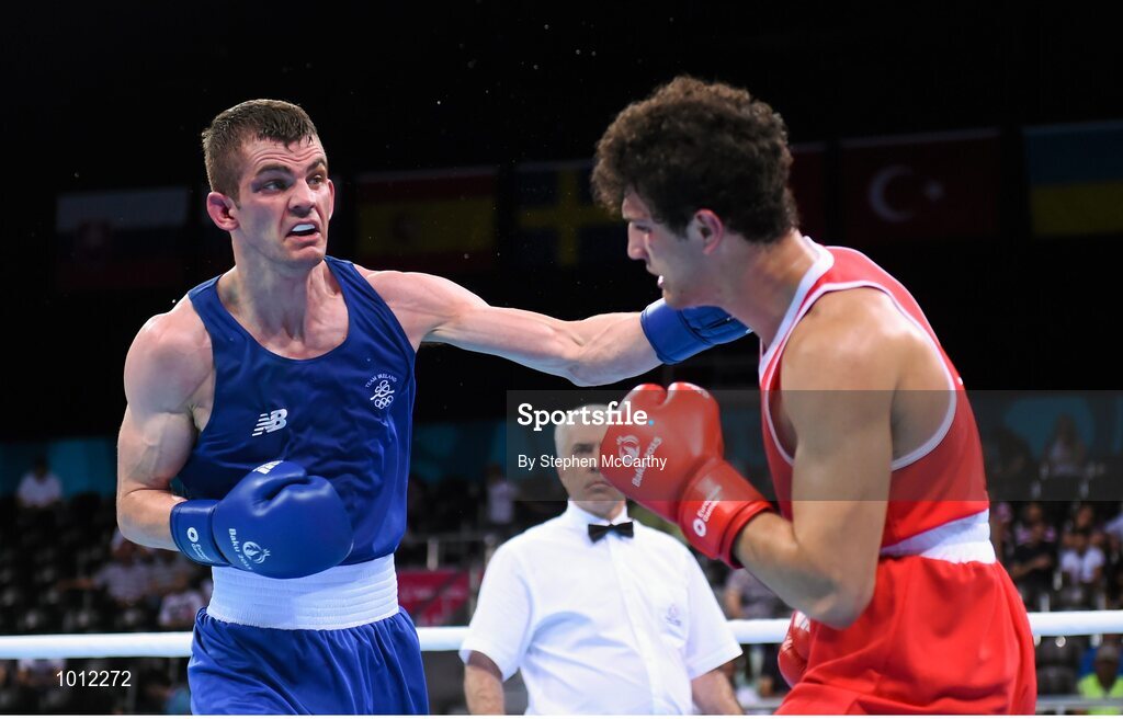 20 June 2015; Adam Nolan, Ireland, left, exchanges punches with Dario Morello, Italy, during their Men's Boxing Welter 69kg Round of 16 bout. 2015 European Games, Crystal Hall, Baku, Azerbaijan. Picture credit: Stephen McCarthy / SPORTSFILE