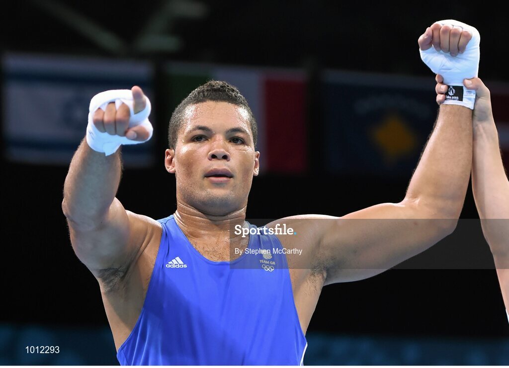 20 June 2015; Joe Joyce, Great Britain, celebrates defeating Alexei Zavatin, Moldova, following their Men's Boxing Super Heavy +91kg Round of 16 bout. 2015 European Games, Crystal Hall, Baku, Azerbaijan. Picture credit: Stephen McCarthy / SPORTSFILE