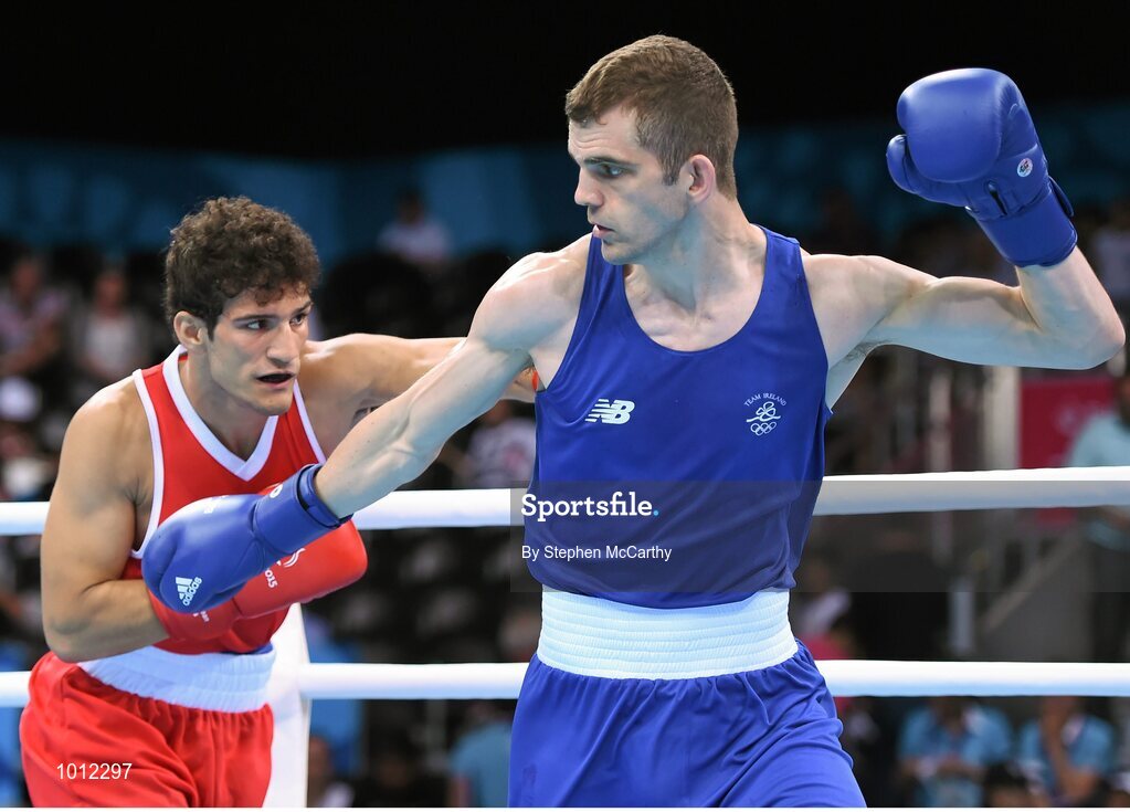 20 June 2015; Adam Nolan, Ireland, right, exchanges punches with Dario Morello, Italy, during their Men's Boxing Welter 69kg Round of 16 bout. 2015 European Games, Crystal Hall, Baku, Azerbaijan. Picture credit: Stephen McCarthy / SPORTSFILE
