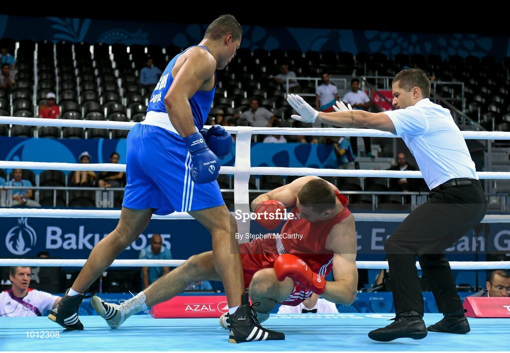 20 June 2015; Joe Joyce, Great Britain, knocks Alexei Zavatin, Moldova, to the canvas for the third time during the first round during their Men's Boxing Super Heavy +91kg Round of 16 bout. 2015 European Games, Crystal Hall, Baku, Azerbaijan. Picture credit: Stephen McCarthy / SPORTSFILE