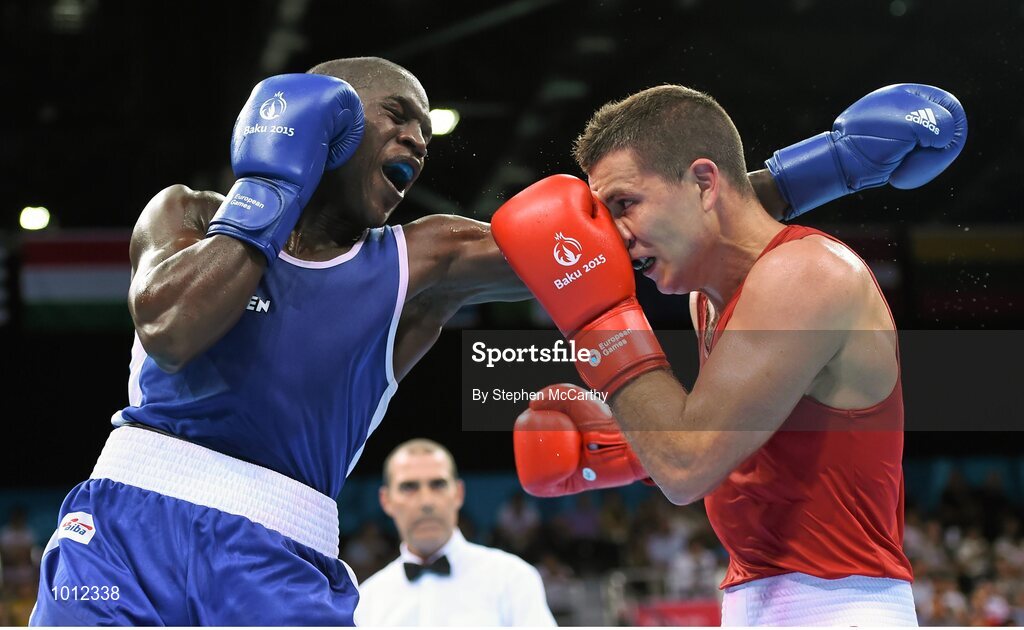 20 June 2015; Souleymane Cissokho, France, left, exchanges punches with Balazs Bacskai, Hungary, during their Men's Boxing Welter 69kg Round of 16 bout. 2015 European Games, Crystal Hall, Baku, Azerbaijan. Picture credit: Stephen McCarthy / SPORTSFILE