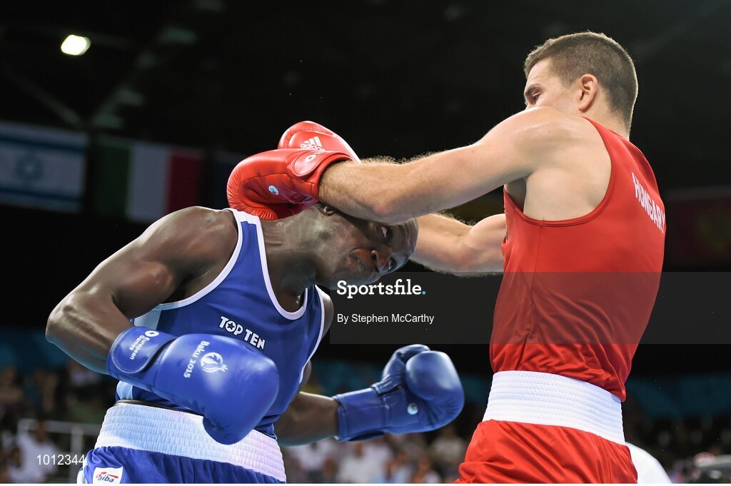 20 June 2015; Souleymane Cissokho, France, left, exchanges punches with Balazs Bacskai, Hungary, during their Men's Boxing Welter 69kg Round of 16 bout. 2015 European Games, Crystal Hall, Baku, Azerbaijan. Picture credit: Stephen McCarthy / SPORTSFILE