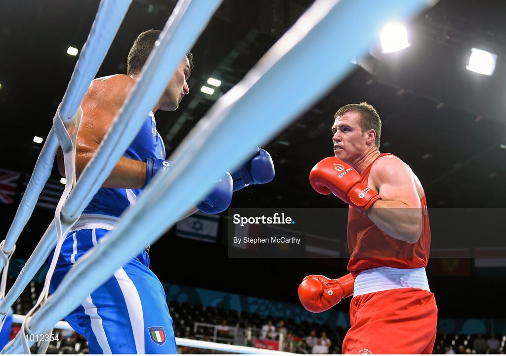 20 June 2015; Dean Gardiner, Ireland, right, exchanges punches with Guido Vianello, Italy, during their Men's Boxing Super Heavy +91kg Round of 16 bout. 2015 European Games, Crystal Hall, Baku, Azerbaijan. Picture credit: Stephen McCarthy / SPORTSFILE