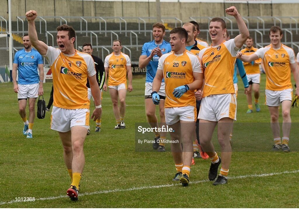 20 June 2015; Antrim players from left, Conor Murray, Patrick McBride, and Owen Gallagher celebrate after the game. GAA Football All-Ireland Senior Championship, Round 1A, Laois v Antrim, O'Moore Park, Portlaoise, Co. Laois. Picture credit: Piaras Ó Mídheach / SPORTSFILE