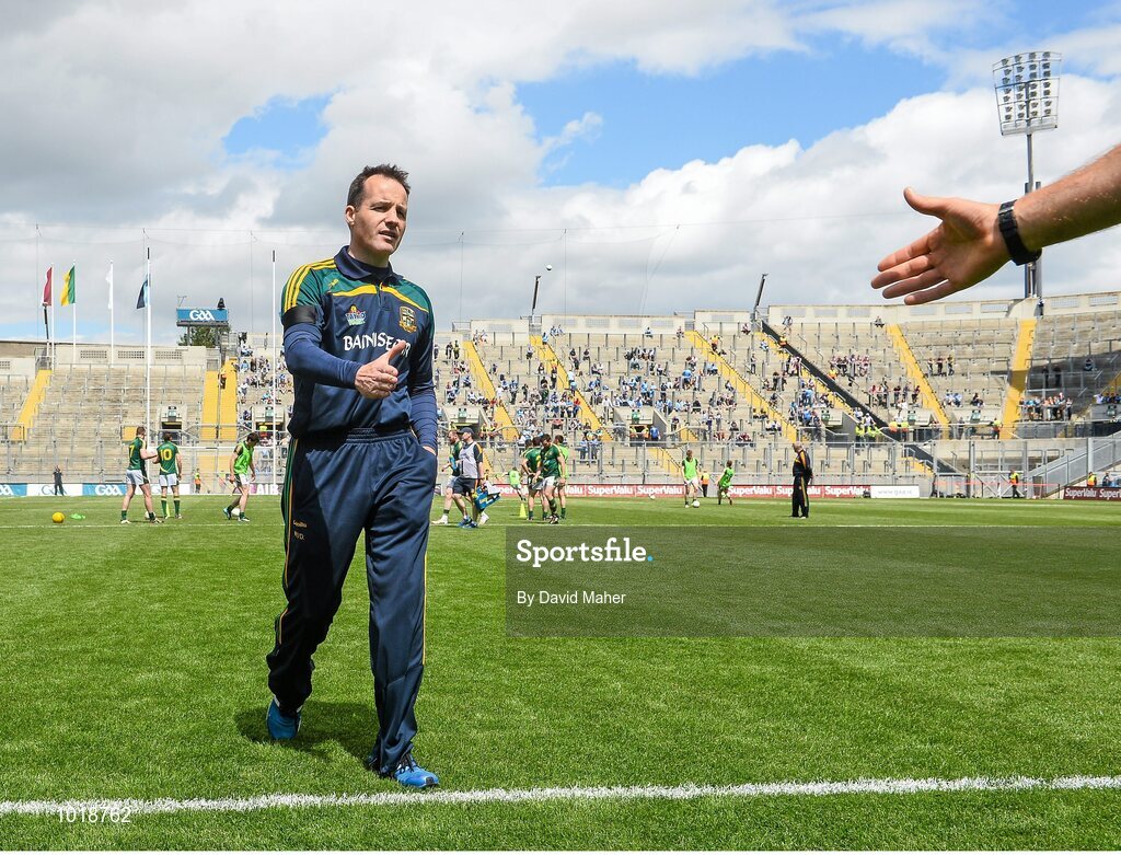 28 June 2015; Mick O'Dowd, Meath manager, prepares to shake hands with referee Conor Lane. Leinster GAA Football Senior Championship, Semi-Final, Westmeath v Meath. Croke Park, Dublin. Picture credit: David Maher / SPORTSFILE