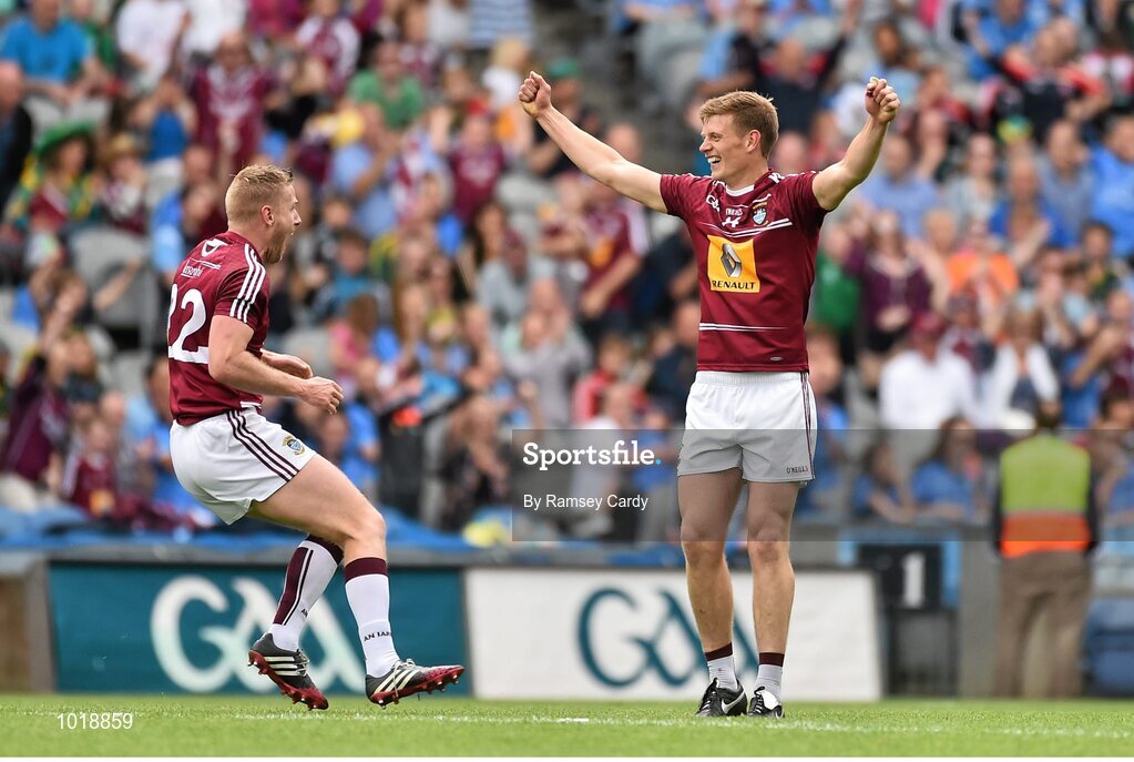 28 June 2015; Westmeath's John Heslin, right, and Dennis Glennon celebrate following their side's victory. Leinster GAA Football Senior Championship, Semi-Final, Westmeath v Meath. Croke Park, Dublin. Picture credit: Ramsey Cardy / SPORTSFILE