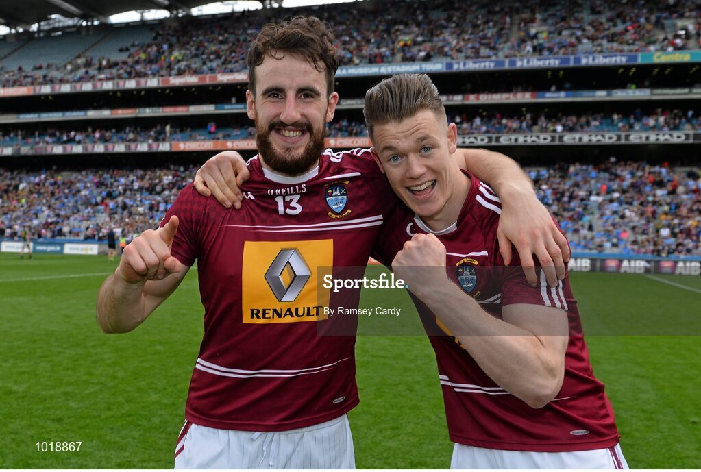 28 June 2015; Westmeath's Lorcan Smyth, left, and Shane Dempsey celebrate following their side's victory. Leinster GAA Football Senior Championship, Semi-Final, Westmeath v Meath. Croke Park, Dublin. Picture credit: Ramsey Cardy / SPORTSFILE