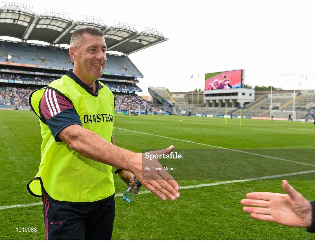 28 June 2015; Tom Cribbin, Westmeath manager, is congratulated at the end of the game. Leinster GAA Football Senior Championship, Semi-Final, Westmeath v Meath. Croke Park, Dublin. Picture credit: David Maher / SPORTSFILE