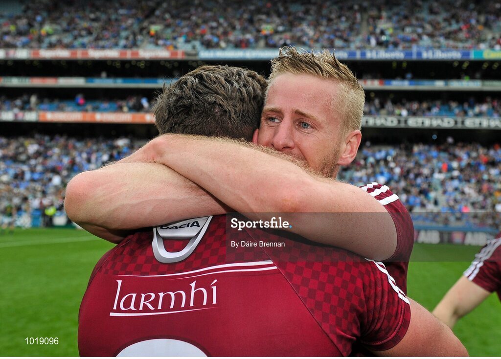 28 June 2015; Westmeath players Paul Sharry, left, and Denis Glennon, celebrate after the game. Leinster GAA Football Senior Championship, Semi-Final, Westmeath v Meath. Croke Park, Dublin. Picture credit: Dáire Brennan / SPORTSFILE