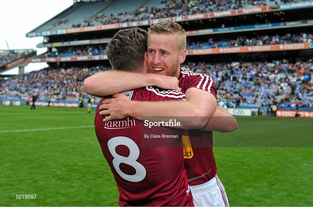 28 June 2015; Westmeath players Paul Sharry, left, and Denis Glennon, celebrate after the game. Leinster GAA Football Senior Championship, Semi-Final, Westmeath v Meath. Croke Park, Dublin. Picture credit: Dáire Brennan / SPORTSFILE