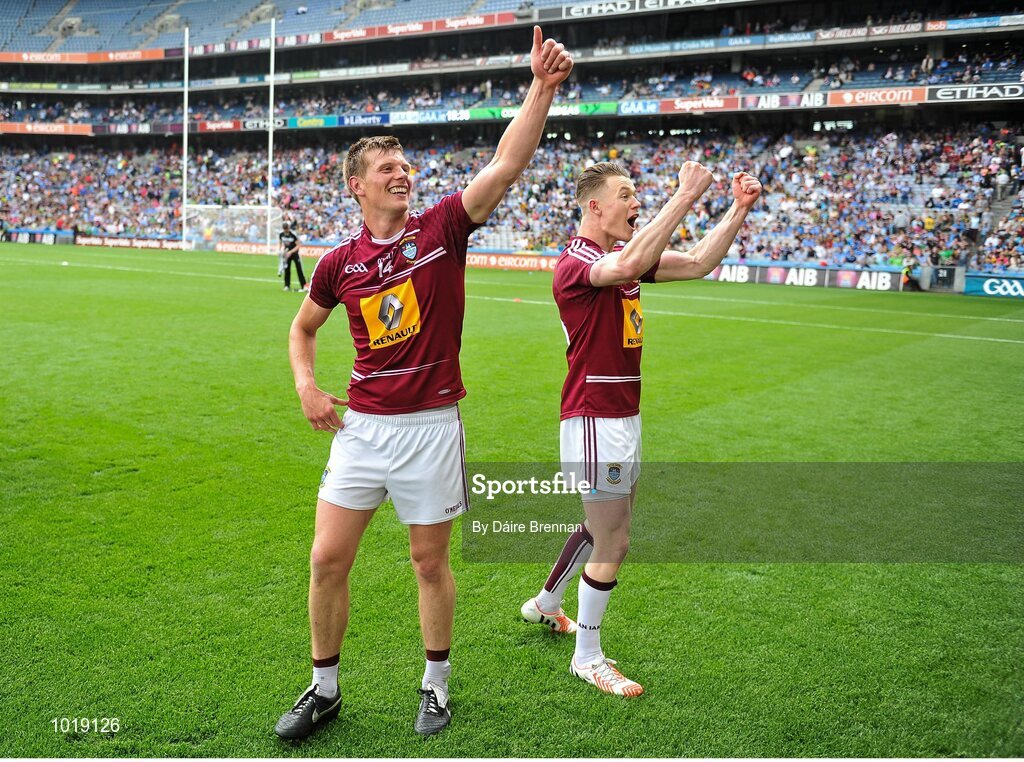 28 June 2015; Westmeath players John Heslin, left, and Shane Dempsey, celebrate after the game. Leinster GAA Football Senior Championship, Semi-Final, Westmeath v Meath. Croke Park, Dublin. Picture credit: Dáire Brennan / SPORTSFILE