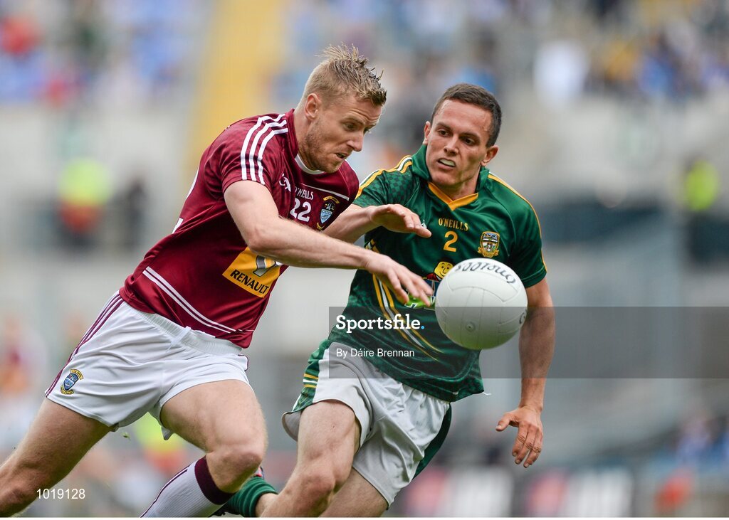 28 June 2015; Dennis Glennon, Westmeath, in action against James McEntee, Meath. Leinster GAA Football Senior Championship, Semi-Final, Westmeath v Meath. Croke Park, Dublin. Picture credit: Dáire Brennan / SPORTSFILE