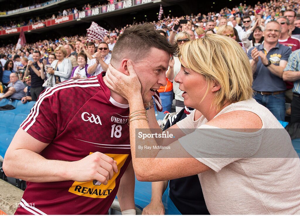 28 June 2015; Westmeath's John Connellan is congratulated by his sister Eimer after the game. Leinster GAA Football Senior Championship, Semi-Final, Westmeath v Meath. Croke Park, Dublin. Picture credit: Ray McManus / SPORTSFILE