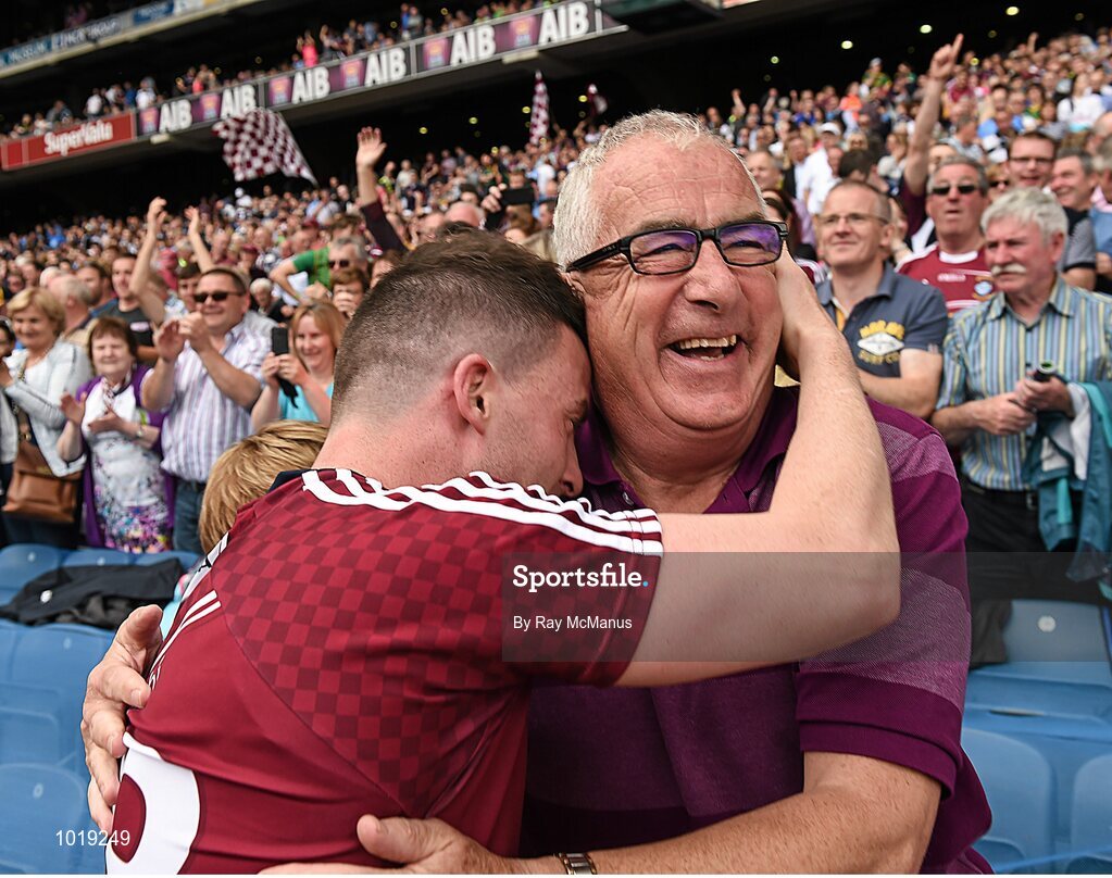 28 June 2015; Westmeath's John Connellan is congratulated by his dad Paul after the game. Leinster GAA Football Senior Championship, Semi-Final, Westmeath v Meath. Croke Park, Dublin. Picture credit: Ray McManus / SPORTSFILE