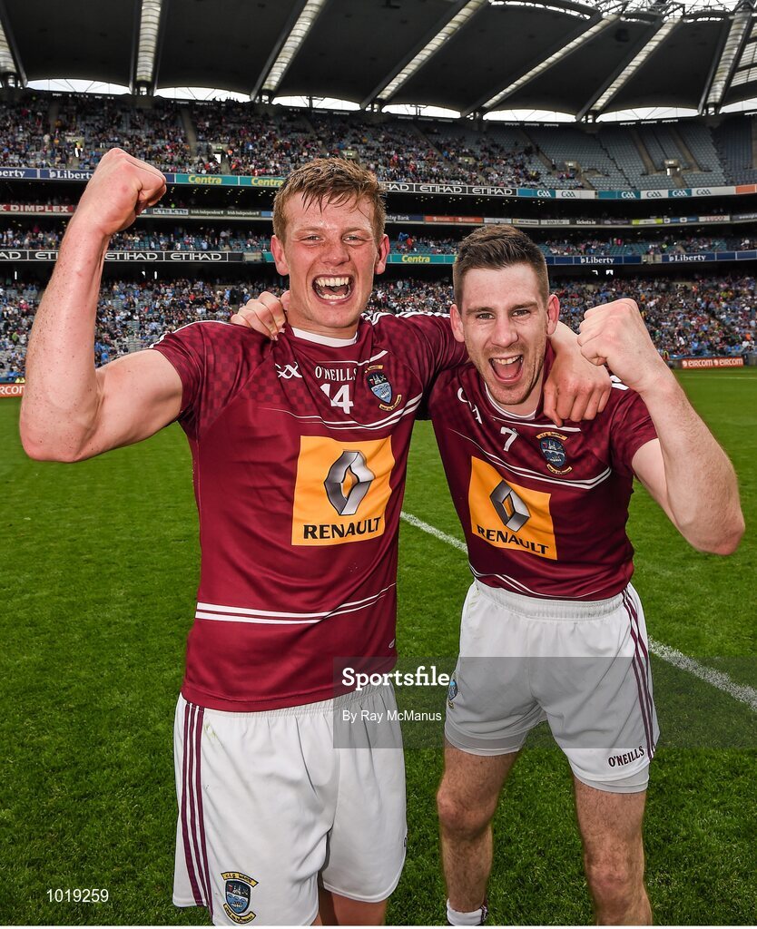 28 June 2015; Westmeath's John Heslin and James Dolan celebrate after the game. Leinster GAA Football Senior Championship, Semi-Final, Westmeath v Meath. Croke Park, Dublin. Picture credit: Ray McManus / SPORTSFILE