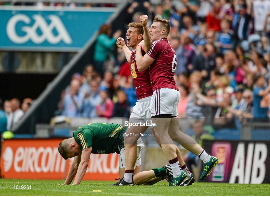 28 June 2015; John Heslin, left, and Kieran Martin, Westmeath, celebrate after Heslin scored his side's third goal. Leinster GAA Football Senior Championship, Semi-Final, Westmeath v Meath. Croke Park, Dublin. Picture credit: Dáire Brennan / SPORTSFILE