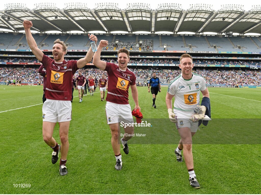 28 June 2015; Westmeath players from left, Kevin Maguire, Kieran Gavin and Darren Quinn. Leinster GAA Football Senior Championship, Semi-Final, Westmeath v Meath. Croke Park, Dublin. Picture credit: David Maher / SPORTSFILE