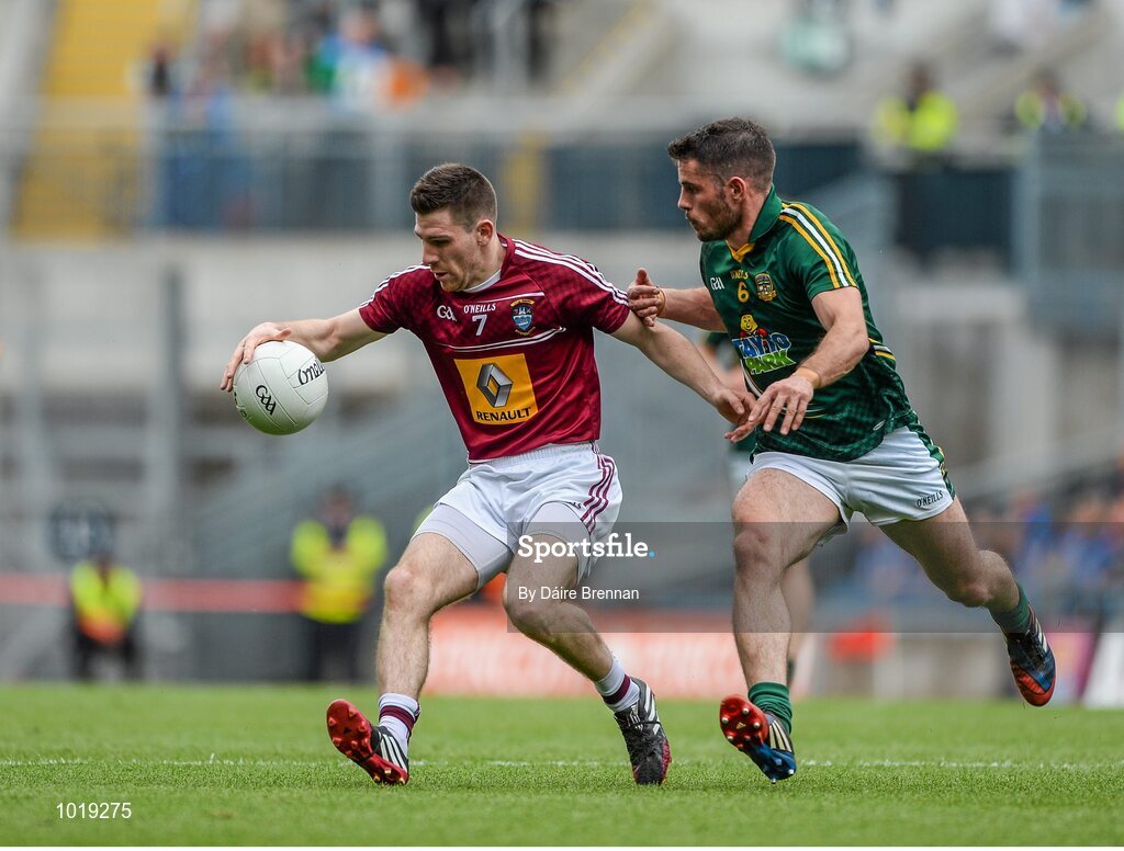 28 June 2015; James Dolan, Westmeath, in action against Donal Keogan, Meath. Leinster GAA Football Senior Championship, Semi-Final, Westmeath v Meath. Croke Park, Dublin. Picture credit: Dáire Brennan / SPORTSFILE