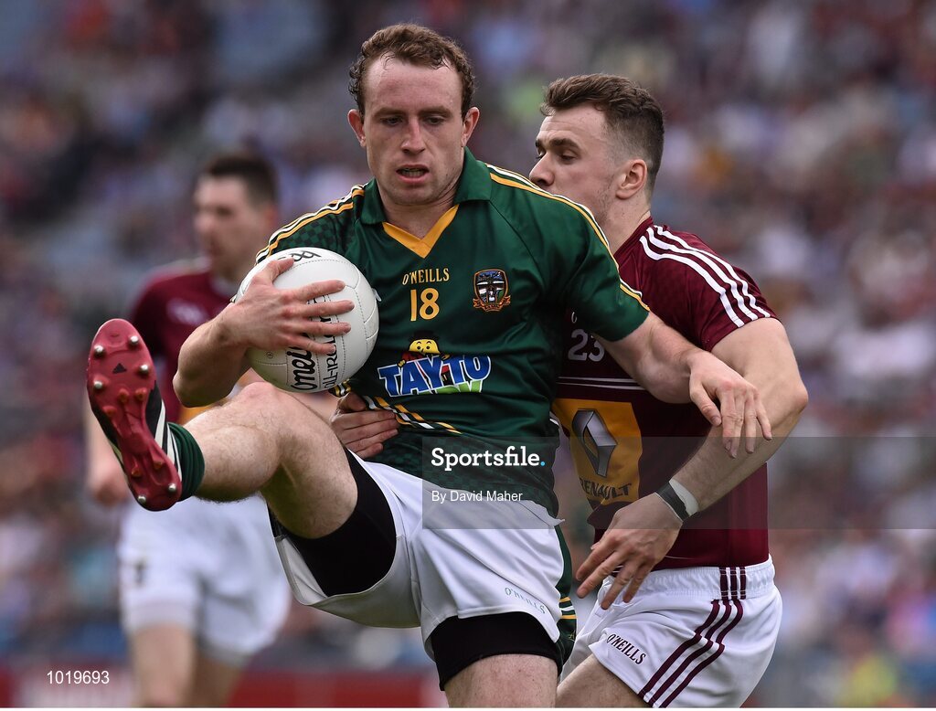 28 June 2015; Eamon Wallace, Meath, in action against Jamie Gounod, Westmeath. Leinster GAA Football Senior Championship, Semi-Final, Westmeath v Meath. Croke Park, Dublin. Picture credit: David Maher / SPORTSFILE