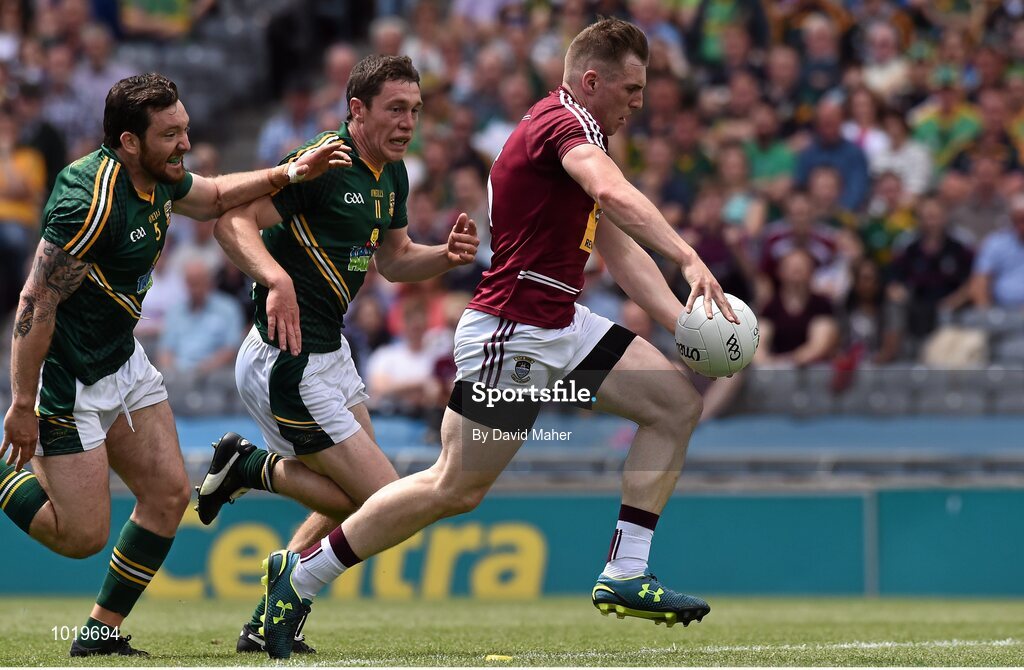28 June 2015; Kieran Martin, Westmeath, scores his side's first goal from Padraic Harnan and Micheal Burke, Meath. Leinster GAA Football Senior Championship, Semi-Final, Westmeath v Meath. Croke Park, Dublin. Picture credit: David Maher / SPORTSFILE