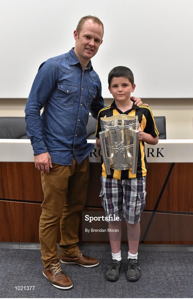 4 July 2015; Kilkenny great Tommy Walsh with David Power, Sallins, Co. Kildare, and the Liam MacCarthy Cup at today’s Bord Gáis Energy Legends Tour at Croke Park, where he relived some of most memorable moments from his playing career. All Bord Gáis Energy Legends Tours include a trip to the GAA Museum, which is home to many exclusive exhibits, including the official GAA Hall of Fame. For booking and ticket information about the GAA legends for this summer’s tours visit www.crokepark.ie/gaa-museum. Croke Park, Dublin. Picture credit: Brendan Moran / SPORTSFILE