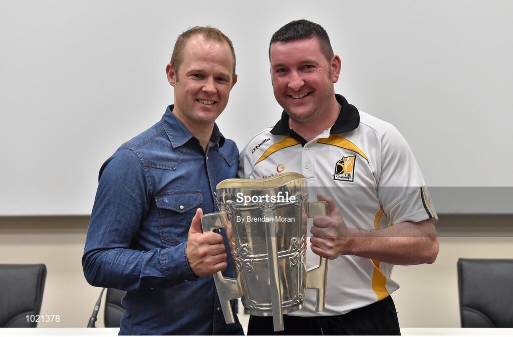 4 July 2015; Kilkenny great Tommy Walsh with Martin Birt, Co. Derry, and the Liam MacCarthy Cup at today’s Bord Gáis Energy Legends Tour at Croke Park, where he relived some of most memorable moments from his playing career. All Bord Gáis Energy Legends Tours include a trip to the GAA Museum, which is home to many exclusive exhibits, including the official GAA Hall of Fame. For booking and ticket information about the GAA legends for this summer’s tours visit www.crokepark.ie/gaa-museum. Croke Park, Dublin. Picture credit: Brendan Moran / SPORTSFILE