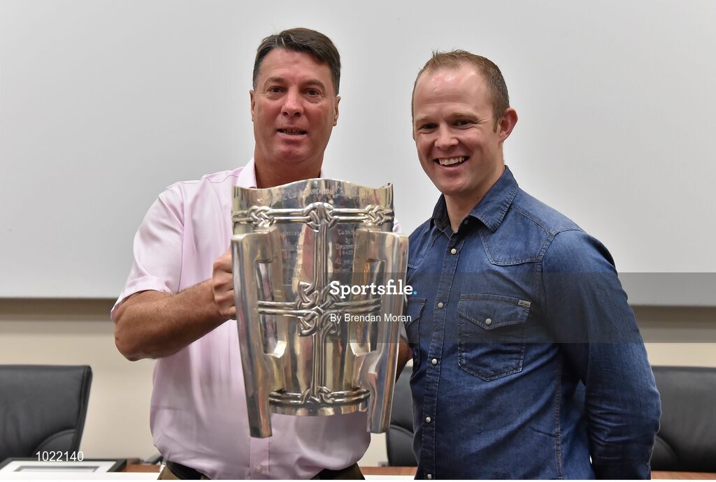 4 July 2015; Kilkenny great Tommy Walsh with Joe Everard, Tipperary, and the Liam MacCarthy Cup at today’s Bord Gáis Energy Legends Tour at Croke Park, where he relived some of most memorable moments from his playing career. All Bord Gáis Energy Legends Tours include a trip to the GAA Museum, which is home to many exclusive exhibits, including the official GAA Hall of Fame. For booking and ticket information about the GAA legends for this summer’s tours visit www.crokepark.ie/gaa-museum. Croke Park, Dublin. Picture credit: Brendan Moran / SPORTSFILE