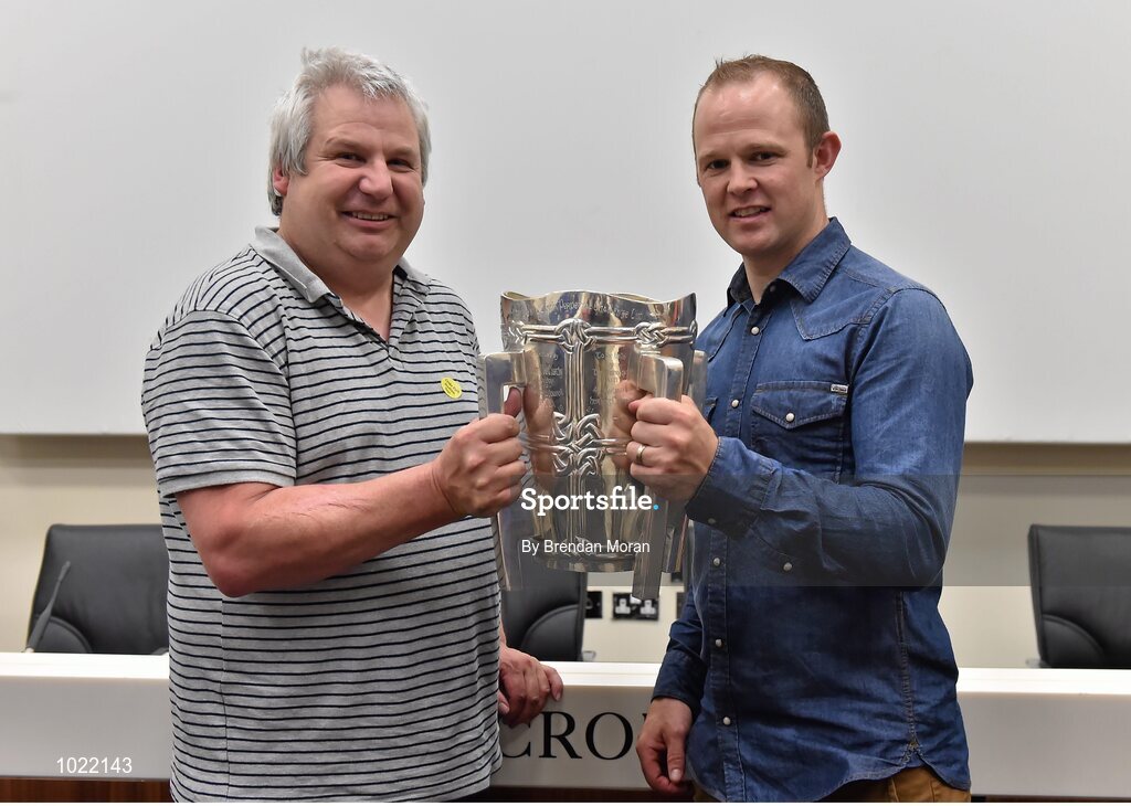 4 July 2015; Kilkenny great Tommy Walsh with Kenneth Jones, Bennetsbridge, Co. Kilkenny, and the Liam MacCarthy Cup at today’s Bord Gáis Energy Legends Tour at Croke Park, where he relived some of most memorable moments from his playing career. All Bord Gáis Energy Legends Tours include a trip to the GAA Museum, which is home to many exclusive exhibits, including the official GAA Hall of Fame. For booking and ticket information about the GAA legends for this summer’s tours visit www.crokepark.ie/gaa-museum. Croke Park, Dublin. Picture credit: Brendan Moran / SPORTSFILE