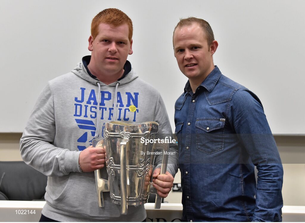 4 July 2015; Kilkenny great Tommy Walsh with John Nevin, Gowran, Co. Kilkenny, and the Liam MacCarthy Cup at today’s Bord Gáis Energy Legends Tour at Croke Park, where he relived some of most memorable moments from his playing career. All Bord Gáis Energy Legends Tours include a trip to the GAA Museum, which is home to many exclusive exhibits, including the official GAA Hall of Fame. For booking and ticket information about the GAA legends for this summer’s tours visit www.crokepark.ie/gaa-museum. Croke Park, Dublin. Picture credit: Brendan Moran / SPORTSFILE