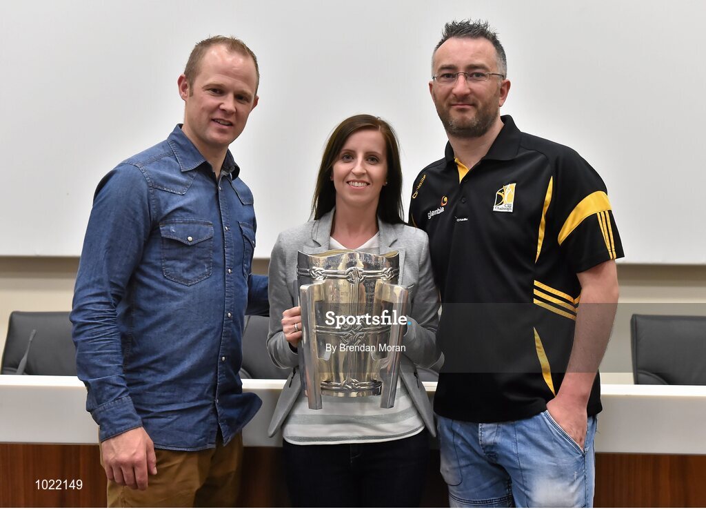 4 July 2015; Kilkenny great Tommy Walsh with Claire O'Rourke, from Dublin, and Joe McCormack, from Kilkenny, and the Liam MacCarthy Cup at today’s Bord Gáis Energy Legends Tour at Croke Park, where he relived some of most memorable moments from his playing career. All Bord Gáis Energy Legends Tours include a trip to the GAA Museum, which is home to many exclusive exhibits, including the official GAA Hall of Fame. For booking and ticket information about the GAA legends for this summer’s tours visit www.crokepark.ie/gaa-museum. Croke Park, Dublin. Picture credit: Brendan Moran / SPORTSFILE