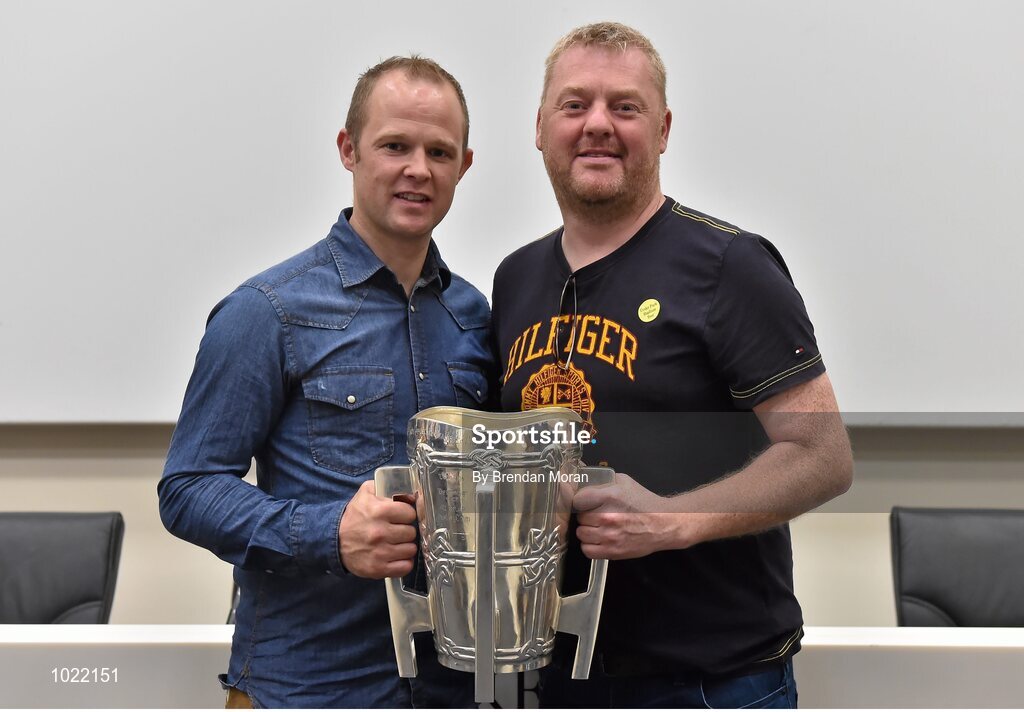 4 July 2015; Kilkenny great Tommy Walsh with Anthony Campion, from Castlecomer, Co. Kilkenny, and the Liam MacCarthy Cup at today’s Bord Gáis Energy Legends Tour at Croke Park, where he relived some of most memorable moments from his playing career. All Bord Gáis Energy Legends Tours include a trip to the GAA Museum, which is home to many exclusive exhibits, including the official GAA Hall of Fame. For booking and ticket information about the GAA legends for this summer’s tours visit www.crokepark.ie/gaa-museum. Croke Park, Dublin. Picture credit: Brendan Moran / SPORTSFILE
