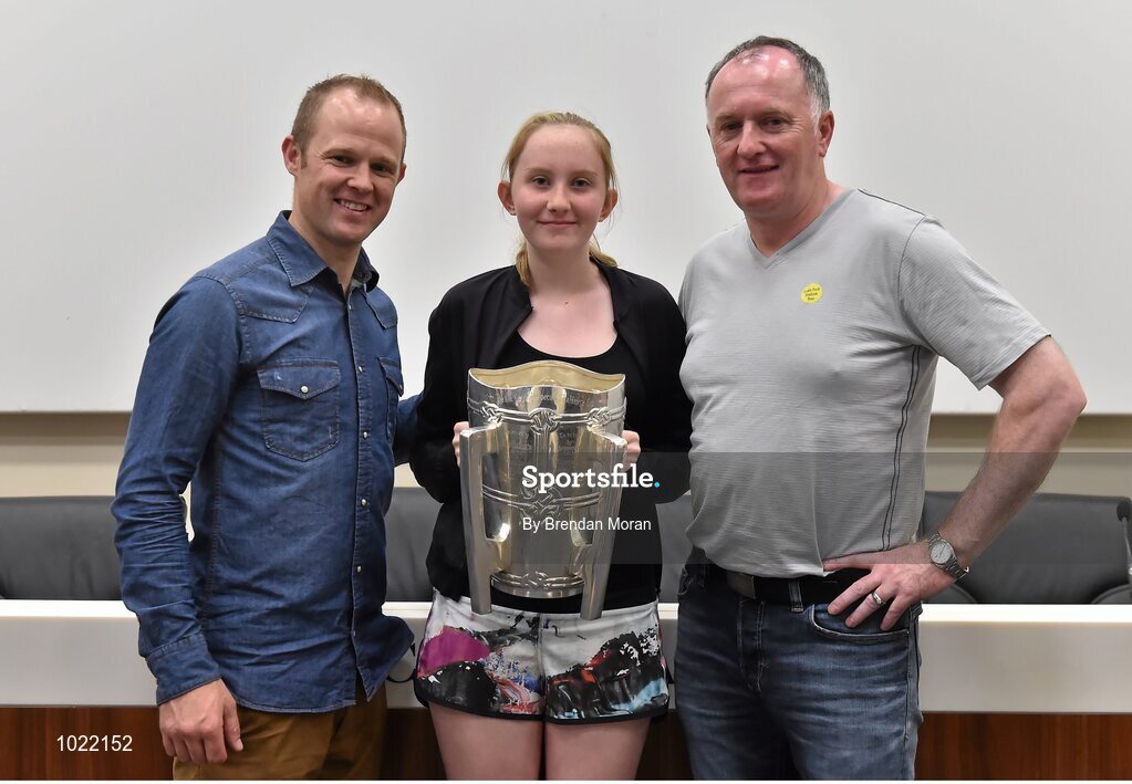 4 July 2015; Kilkenny great Tommy Walsh with Rebecca and Peter Murray, from Galway, and the Liam MacCarthy Cup at today’s Bord Gáis Energy Legends Tour at Croke Park, where he relived some of most memorable moments from his playing career. All Bord Gáis Energy Legends Tours include a trip to the GAA Museum, which is home to many exclusive exhibits, including the official GAA Hall of Fame. For booking and ticket information about the GAA legends for this summer’s tours visit www.crokepark.ie/gaa-museum. Croke Park, Dublin. Picture credit: Brendan Moran / SPORTSFILE