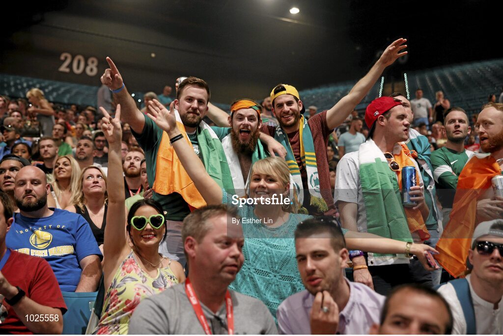 10 July 2015; Irish UFC fans during the weighs in ahead of the UFC 189 Interim Featherweight Title fight between Conor McGregor and Chad Mendes. MGM Grand Garden Arena, Las Vegas, USA. Picture credit: Esther Lin / SPORTSFILE