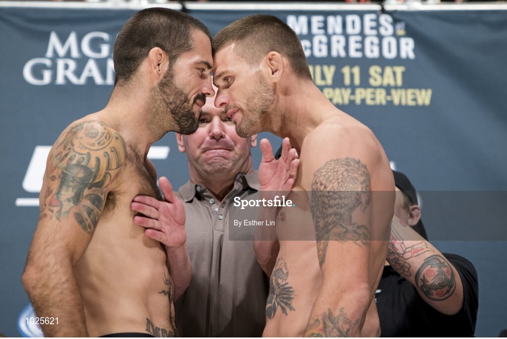 10 July 2015; Matt Brown and Tim Means face off during the weighs in ahead of the UFC 189 Interim Featherweight Title fight between Conor McGregor and Chad Mendes. MGM Grand Garden Arena, Las Vegas, USA. Picture credit: Esther Lin / SPORTSFILE