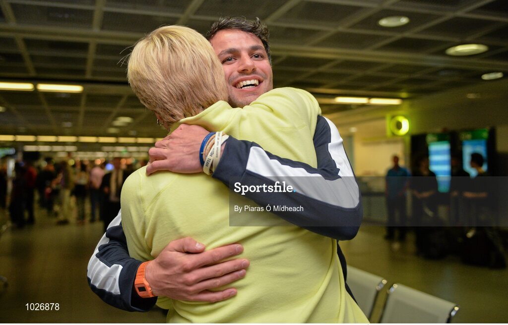 13 July 2015; Ireland's Thomas Barr pictured with his coach Hayley Harrison in Dublin Airport on his arrival home from the World University Games in Gwangju South Korea. Dublin Airport, Dublin. Picture credit: Piaras Ó Mídheach / SPORTSFILE