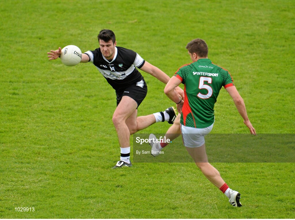 19 July 2015; Pat Hughes, Sligo, in action against Lee Keegan, Mayo. Connacht GAA Football Senior Championship Final, Mayo v Sligo, Dr. Hyde Park, Roscommon. Picture credit: Sam Barnes / SPORTSFILE