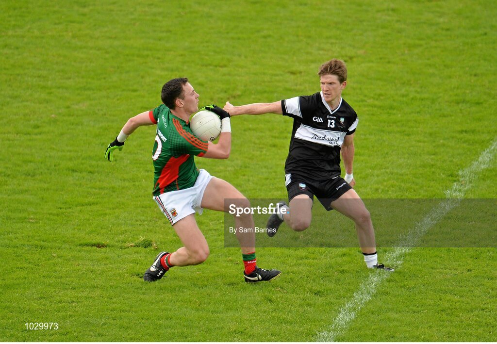 19 July 2015; Diamond O'Connor, Mayo, in action against Andy Moran, Sligo. Connacht GAA Football Senior Championship Final, Mayo v Sligo, Dr. Hyde Park, Roscommon. Picture credit: Sam Barnes / SPORTSFILE