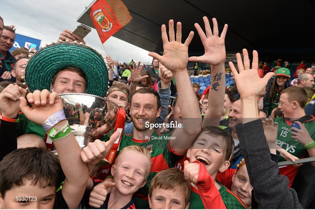 19 July 2015; Mayo captain Keith Higgins celebrates with supporters after Mayo won their fifth Nestor Cup in a row. Connacht GAA Football Senior Championship Final, Mayo v Sligo, Dr. Hyde Park, Roscommon. Picture credit: David Maher / SPORTSFILE