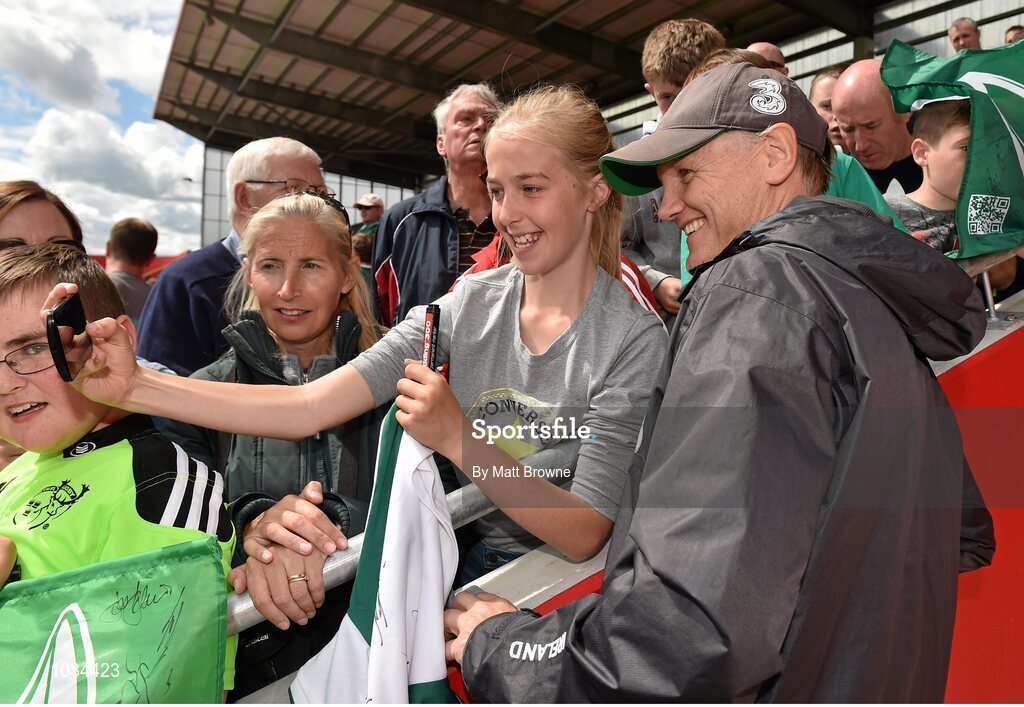 29 July 2015; Ireland head coach Joe Schmidt with Orla Walker, from Courtmacsherry, Co. Cork, after squad training. Irish Independent Park, Cork. Picture credit: Matt Browne / SPORTSFILE