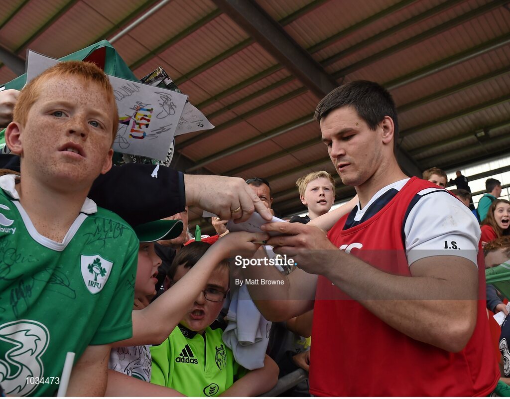 29 July 2015; Ireland's Jonathan Sexton signs autograph for supporters after squad training. Irish Independent Park, Cork. Picture credit: Matt Browne / SPORTSFILE