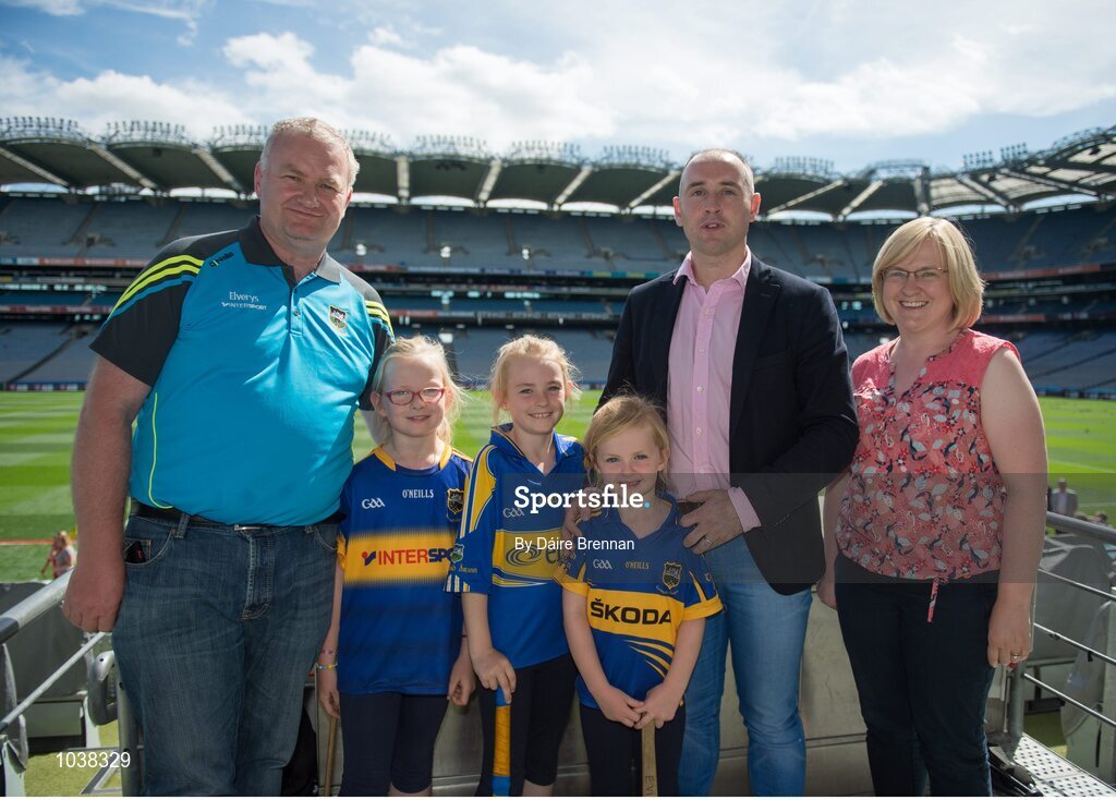 8 August 2015; Tipperary great Eoin Kelly in attendance at today's‚ Bord Gáis Energy Legends Tour at Croke Park, where he relived some of most memorable moments from his playing career, with the Hylands, from Cahir, Co. Tipperary, Tom and Caitríona, with their daughters Kate, aged 9, Emma, aged 7, and Eevie, aged 5. All Bord Gáis Energy Legends Tours include a trip to the GAA Museum, which is home to many exclusive exhibits, including the official GAA Hall of Fame. For booking and ticket information about the GAA legends for this summer visit www.crokepark.ie/gaa-museum. Croke Park, Dublin. Picture credit: Dáire Brennan / SPORTSFILE