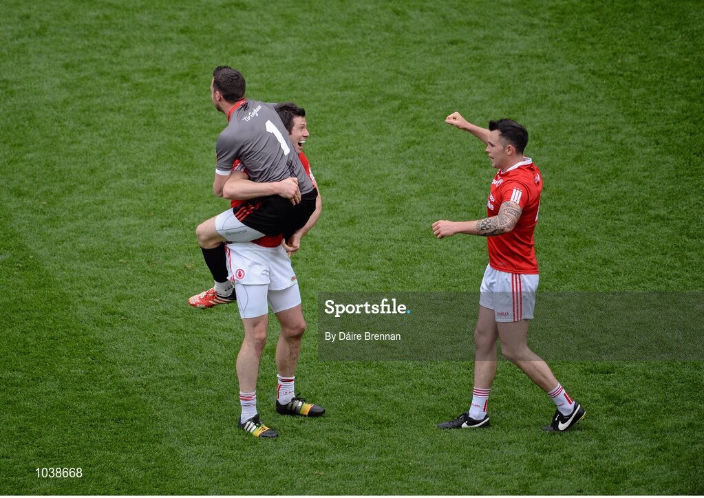 8 August 2015; Tyrone players Niall Morgan, Seán Cavanagh, and Cathal McCarron, celebrate at the end of the game. GAA Football All-Ireland Senior Championship Quarter-Final, Monaghan v Tyrone, Croke Park, Dublin. Picture credit: Dáire Brennan / SPORTSFILE