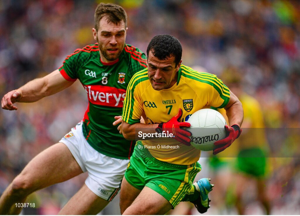 8 August 2015; Frank McGlynn, Donegal, in action against Séamus O'Shea, Mayo. GAA Football All-Ireland Senior Championship Quarter-Final, Donegal v Mayo. Croke Park, Dublin. Picture credit: Piaras Ó Mídheach / SPORTSFILE