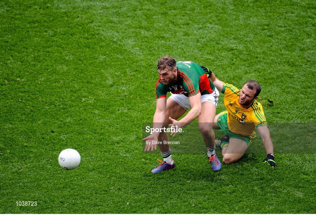8 August 2015; Aidan O'Shea, Mayo, in action against Neil McGee, Donegal. GAA Football All-Ireland Senior Championship Quarter-Final, Donegal v Mayo, Croke Park, Dublin. Picture credit: Dáire Brennan / SPORTSFILE