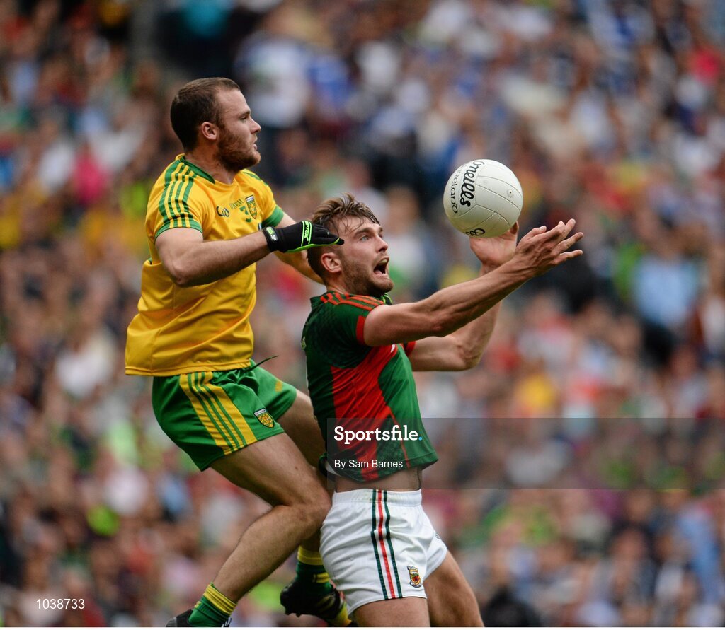8 August 2015; Aidan O'Shea, Mayo, in action against Neil McGee, Donegal. GAA Football All-Ireland Senior Championship Quarter-Final, Donegal v Mayo, Croke Park, Dublin. Picture credit: Sam Barnes / SPORTSFILE