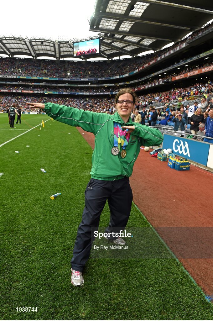 8 August 2015; Team Ireland's Rachel Ryan, a member of Ormond Special Olympics Club, from Templemore, Co. Tipperary, who won a Silver medal in the 100m, a Gold in the 400m and a Silver in the Relay, adopts a Usain Bolt pose as the Special Olympics athletes are presented to the attendees during half time. GAA Football All-Ireland Senior Championship Quarter-Final, Donegal v Mayo, Croke Park, Dublin. Picture credit: Ray McManus / SPORTSFILE