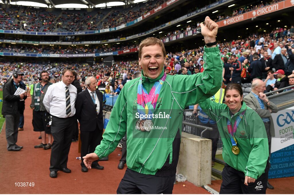 8 August 2015; Team Ireland's Timothy Morahan, a member of South Dublin Special Olympics Sports Club, from Rathmines, Dublin, who won a Silver medal in the Long Jump, a Bronze medal in the 800m and a Silver in the Relay, as the Special Olympics athletes are presented to the attendees during half time. GAA Football All-Ireland Senior Championship Quarter-Final, Donegal v Mayo, Croke Park, Dublin. Picture credit: Ray McManus / SPORTSFILE