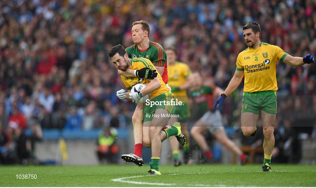 8 August 2015; Donegal's Mark McHugh is tackled by Mayo's Donal Vaughan who was subsequently shown a black card for this tackle. GAA Football All-Ireland Senior Championship Quarter-Final, Donegal v Mayo, Croke Park, Dublin. Picture credit: Ray McManus / SPORTSFILE