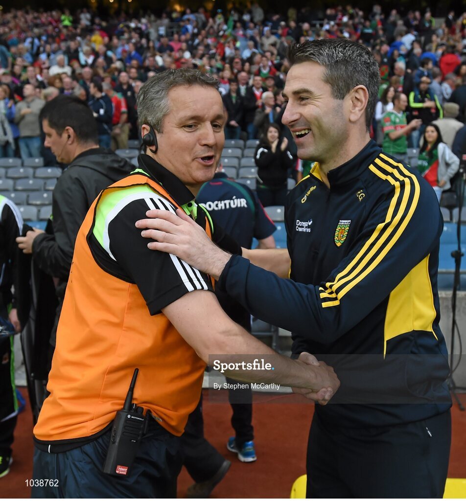 8 August 2015; Mayo joint manager Pat Holmes shakes hands with Donegal manager Rory Gallagher after the game. GAA Football All-Ireland Senior Championship Quarter-Final. Donegal v Mayo, Croke Park, Dublin. Picture credit: Stephen McCarthy / SPORTSFILE