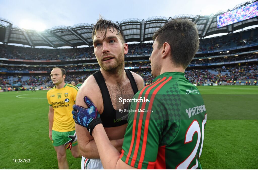 8 August 2015; Aidan O'Shea, left, and Evan Regan, Mayo, following their side's victory. GAA Football All-Ireland Senior Championship Quarter-Final. Donegal v Mayo, Croke Park, Dublin. Picture credit: Stephen McCarthy / SPORTSFILE